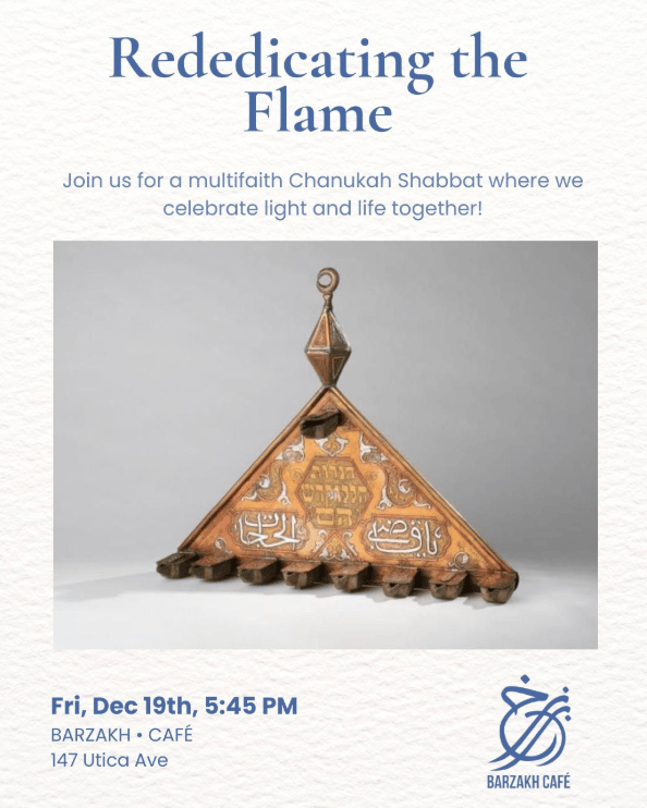 A multi-faith celebration of chanukah at Barzakh, with a mystical workshop led by Haddar Cohen, a community activity led by Daniel Mate (Gabor Mate’s son) and singing by Laura Elkeslassy. The evening will include dinner & beverage and is open to people from all backgrounds.