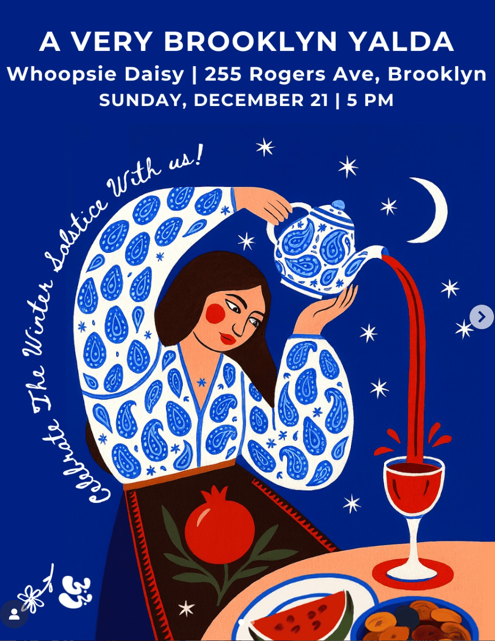 Lena is the brain (and hands) behind Bibi Bakery, named after her Iranian grandmother, and she’s hosting a delicious Yalda celebration filled with tea, ash reshteh, baklava, wine, backgammon, poetry, and all the cozy vibes. Bring your friends, your poems, your appetite, and come warm up, physically and spiritually with Lena.