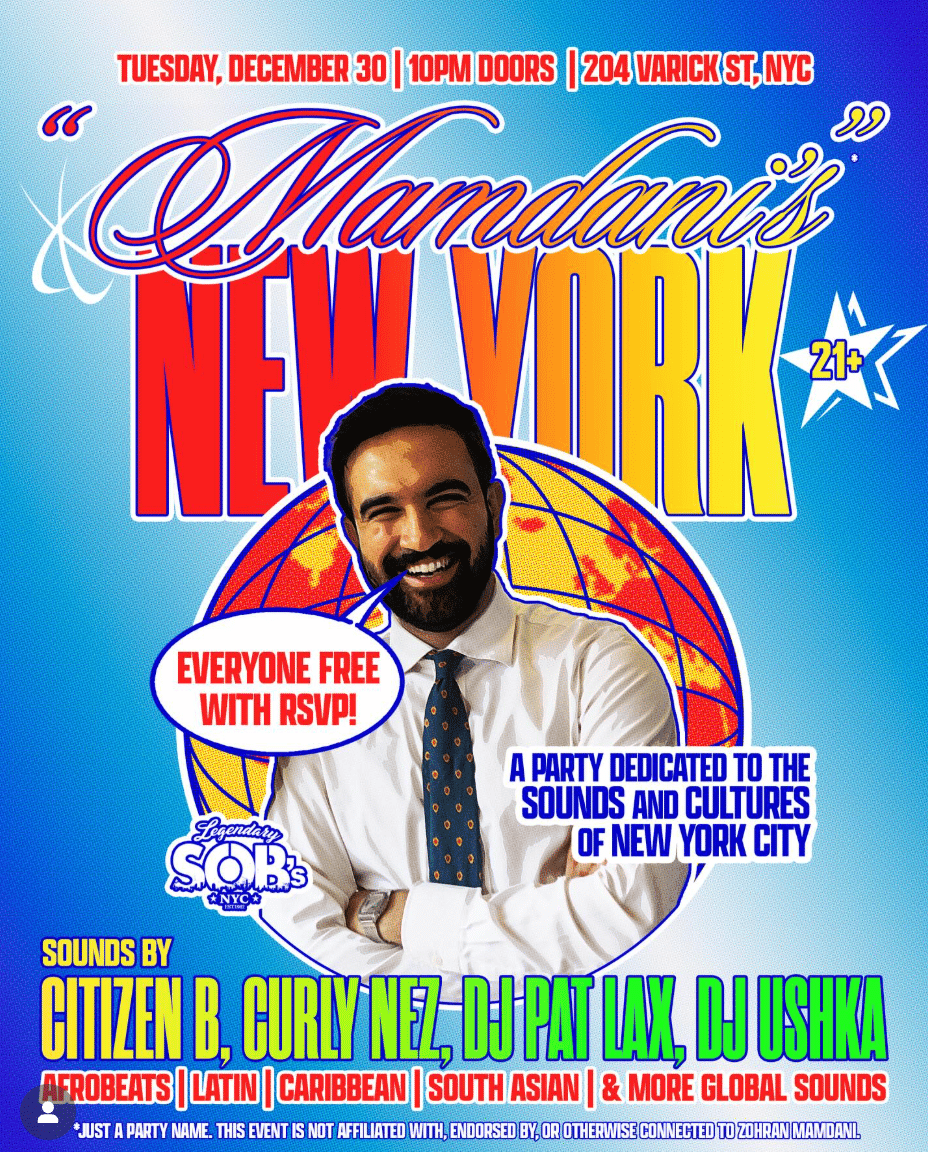 A pop-up party the night before NYE. Celebrating the sounds & cultures that make us the greatest city in the world, in true Mamdani spirit.